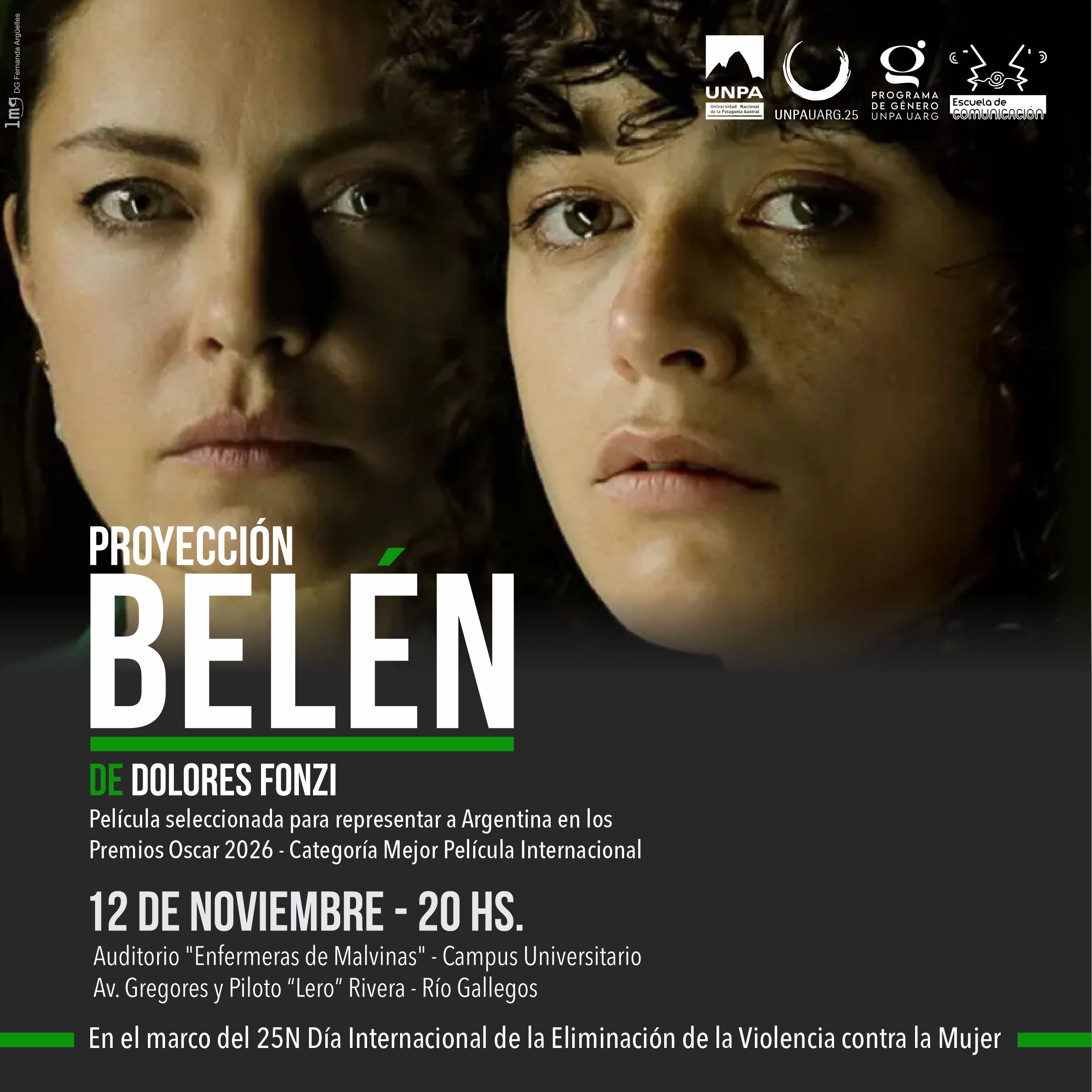 La Unidad Académica Río Gallegos de la UNPA, a través del área de Género y Diversidades y la Escuela de Comunicación, invita a la proyección de "Belén" de Dolores Fonzi, película seleccionada para representar a Argentina en los Premios Oscar 2026 en la categoría de Mejor Película Internacional.